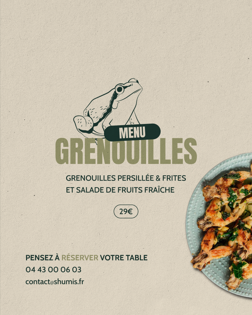 nous vous proposons également notre menu grenouilles persillées, servi avec frites et salade de fruits fraîche.